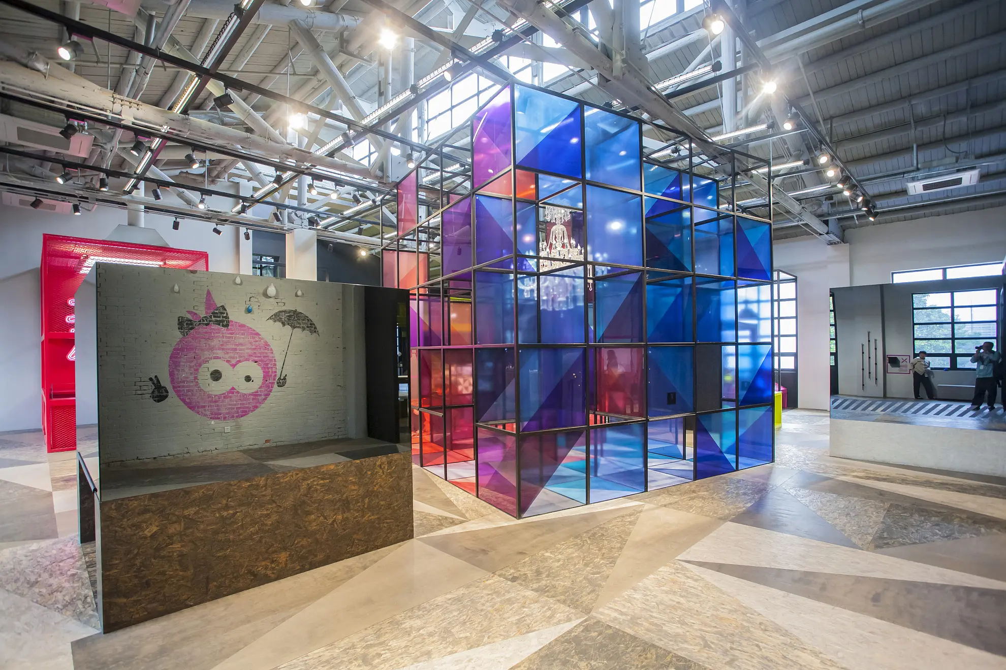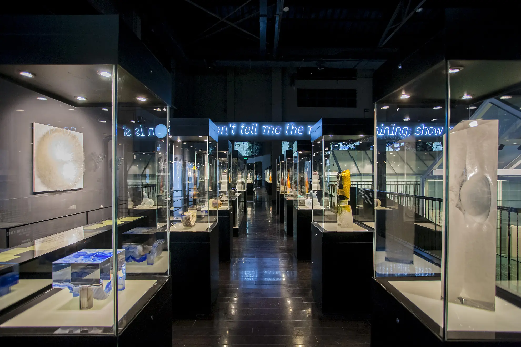 (圖O-1)上海玻璃博物館具有藝術(shù)觀賞性、互動娛樂性與再生創(chuàng)造性。博物館坐落于曾經(jīng)生產(chǎn)玻璃的車間內(nèi),設(shè)計(jì)師保留了原來開放式的頂棚和粗糙的地面,而展柜、家具和墻體等使用了黑色的烤漆玻璃
