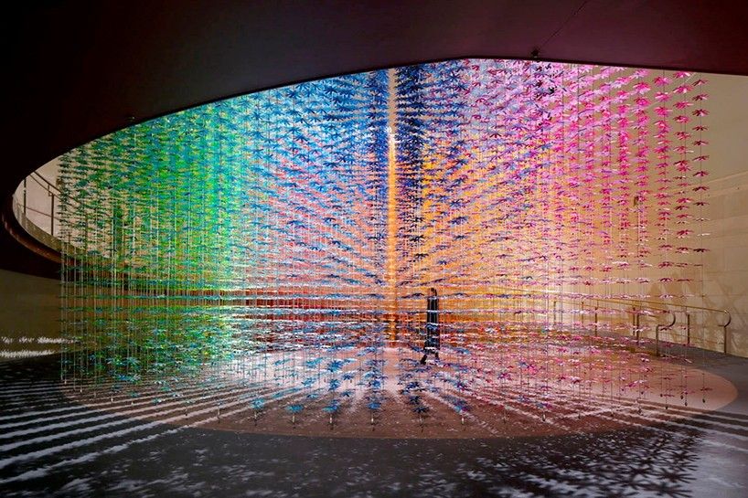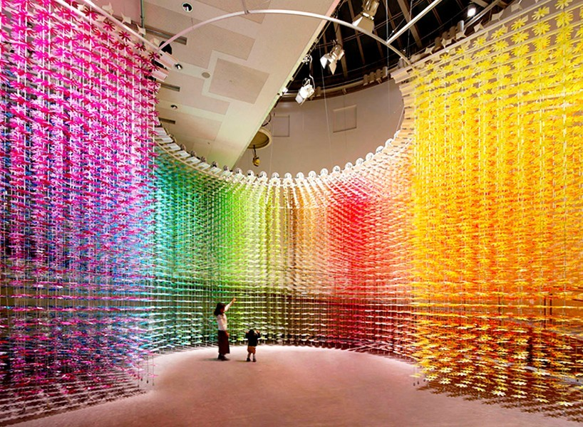 (圖O-2)日本精工株式會社是日本著名的發(fā)動機(jī)和汽車零部件制造商之一!霸谶\(yùn)動中設(shè)定未來(setting the futire in motion )”是慶祝日本精工株式會社成立100周年的展廳設(shè)計(jì)的主題。整個室間由100種顏色組成的25200朵花整齊排列成3D網(wǎng)格狀
