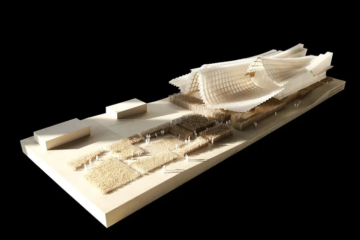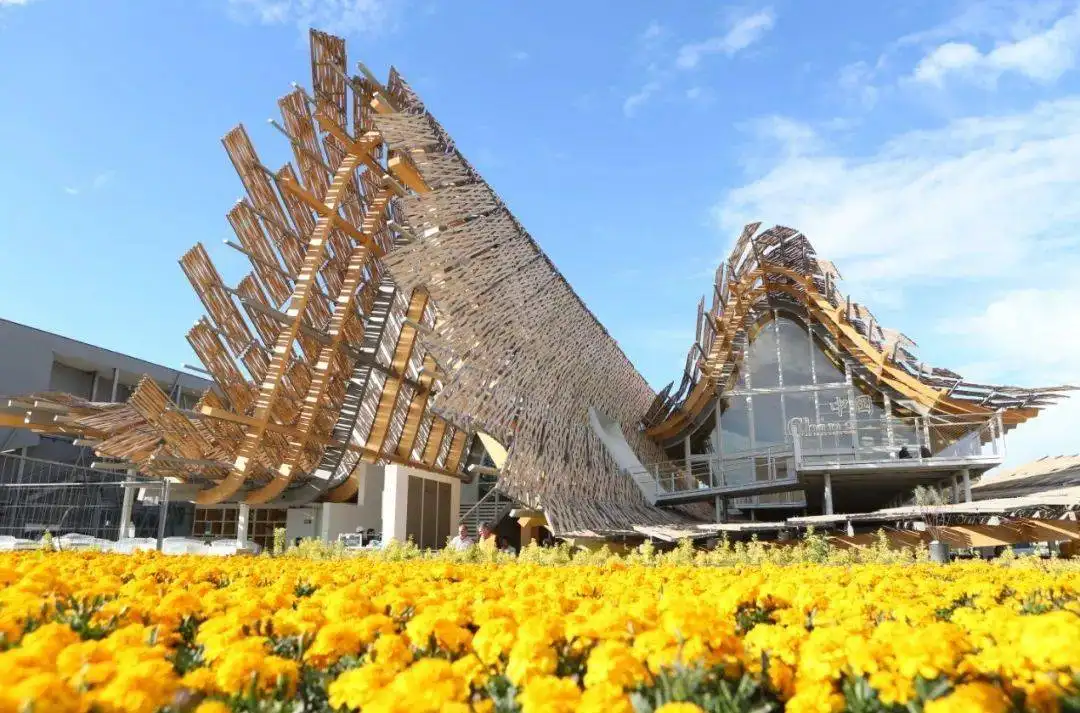圖1-5 2015年意大利米蘭世博會中國國家館(圖片摘門中國設計在線),設計的主題是“希望的田野.生命的源泉”。設計理念正是基于對“天、地、人”的詮釋。“天地人和”蘊含了中華民族的智慧與精神.傳播著中國博大厚重的文化精神、展示出泱洪大國的氣度與風范。