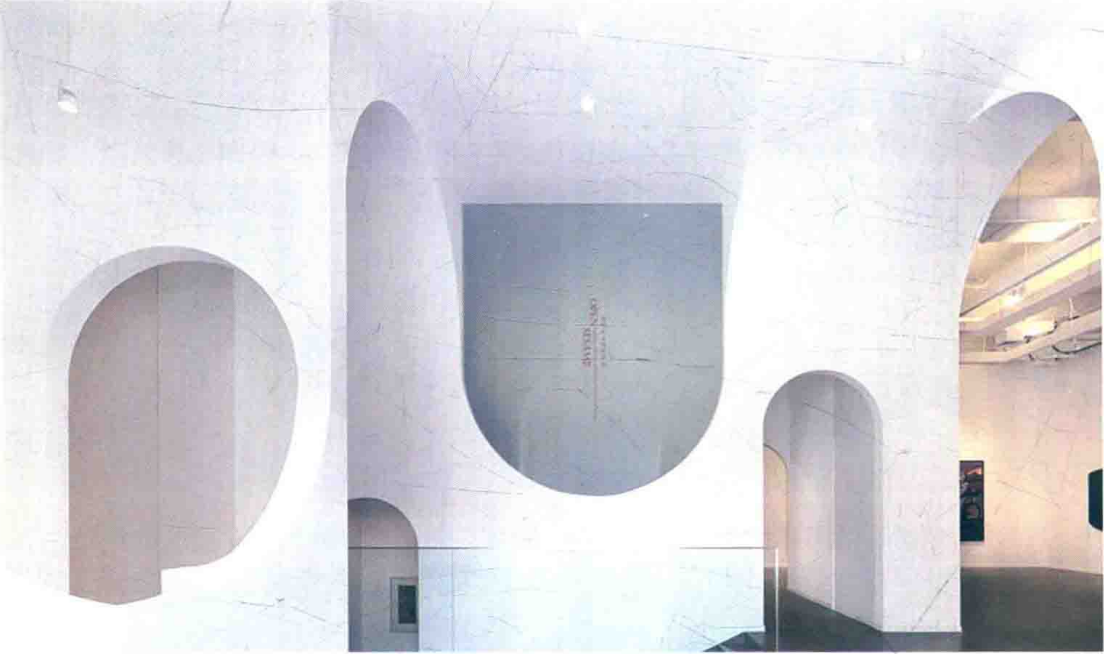 錯視現(xiàn)象是人們在感應外部世界時常有的一種知覺狀態(tài)。借錯視可“將錯就錯”地調(diào)節(jié)視感,強化展示空間的心理感受。利用錯視圖形形成的旋轉(zhuǎn)、閃爍、發(fā)射、波動等動蕩感,或用幻彩顏料畫的背景圖形,都可強化展廳的空間視覺效果(圖5-6 )。